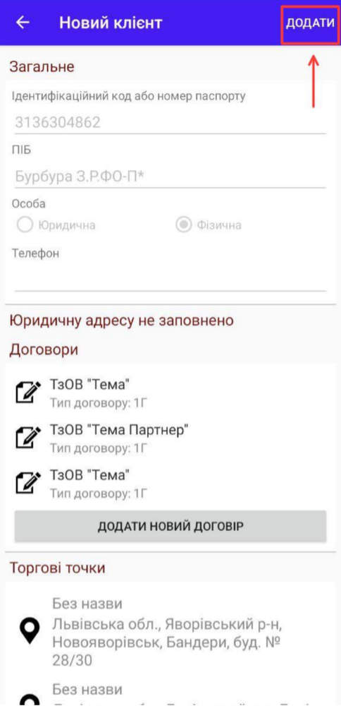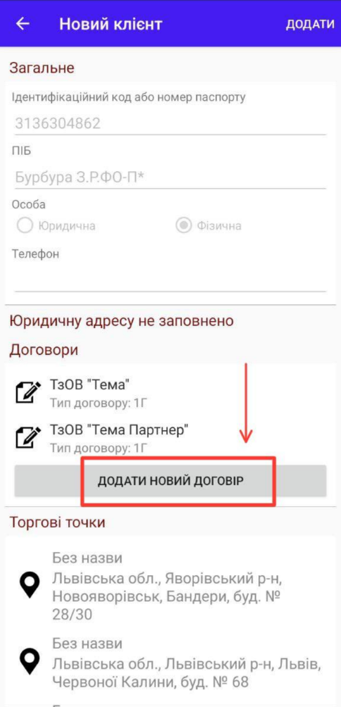 3. Після вибору контрагента з переліку відкрилась картка контрагента з даними. Щоб створити заявку на внесення торгової точки в маршрут потрібно обрати договір, для цього потрібно натиснути на клавішу «ДОДАТИ НОВИЙ ДОГОВІР» та обрати договір по якому потрібно внести контрагента.