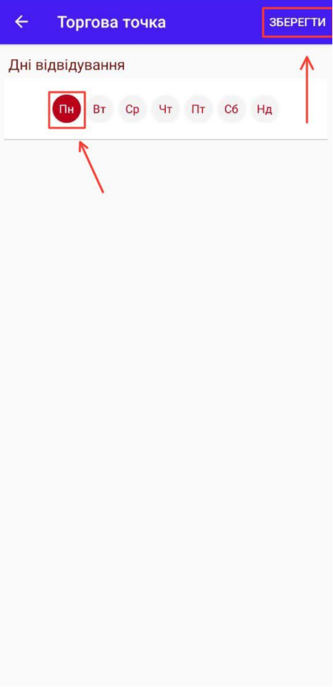 5. Обрати день на який потрібно внести торгову точку у маршрут та натиснути «ЗБЕРЕГТИ».
